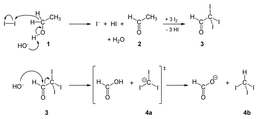 Keywords: Iodoform synthesis.svg iodoform starting form ethanol 1 ; acetaldehyde 2 ; triiodoacetaldehyde 3 ; iodoform-carbanion 4a ; iodoform 4b de Iodoformsynthese aus Ethanol 1 Acetaldehyd 2 ; Triiodacetaldehyd 3 ; Iodoform-Carbanion 4a ; Iodoform 4b Own Yikrazuul 2 12 08 HOLA Iodoform |