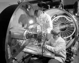 Keywords: eprb electric propulsion research building electricpropulsionresearchbuilding ion engine ionengine lewis research center lewisresearchcenter vacuum tank vacuumtank blackandwhite monochrome indoor black and white Ion engine #1 being installed in the High Vacuum Tank in the Electric Propulsion Research Building - EPRB. This facility is located at the Lewis Research Center, now John H. Glenn Research Center in Cleveland Ohio. This device is the early predecessor of the power system that is sending Deep Space 1 to explore the solar system. Ion engine #1 being installed in the High Vacuum Tank in the Electric Propulsion Research Building - EPRB. This facility is located at the Lewis Research Center, now John H. Glenn Research Center in Cleveland Ohio. This device is the early predecessor of the power system that is sending Deep Space 1 to explore the solar system. |