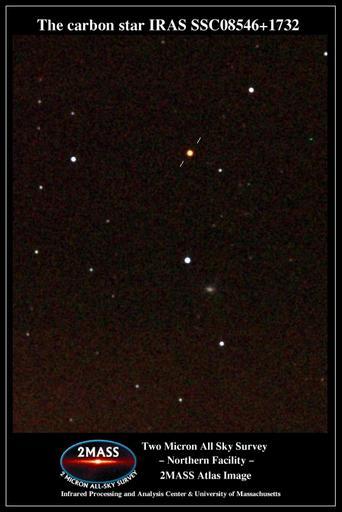 | Keywords: IRAS SSC08546+1732 (2MASS).jpg IRAS SSC08546+1732 a faint heavily dust-enshrouded carbon star at high galactic latitude in the IRAS Serendipitous Survey Catalog see Cutri et al 1989 AJ 97 866 The star has no optical counterpart on the Digitized Sky Survey The latitude and faintness of this star imply that it is in the Galactic halo and either evolved from a Pop I precursor ejected from the Galactic disk or is a obscured halo carbon star of Pop II http //www ipac caltech edu/2mass/gallery/images_iras html 2MASS Atlas Image Gallery Various IRAS Sources Two Micron All Sky Survey 2MASS a joint project of the University of Massachusetts and the Infrared Processing and Analysis Center/California Institute of Technology funded by the National Aeronautics and Space Administration and the National Science Foundation 2MASS Atlas image 2MASS IRAS images |