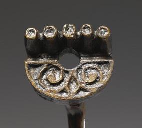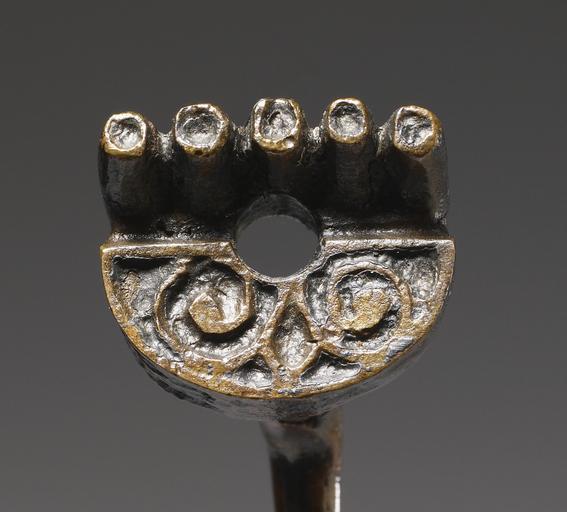 Keywords: Irish Celtic - Hand-Pin - Walters 542370 - Detail.jpg Called a hand-pin because it resembles the palm of the hand with the fingers pointing out at right angles this pin served as a cloak fastener Hand-pins were fashionable in Ireland and Scotland in the 6th and 7th centuries Originally the five pellet fingertips along the top of the pin and the sunken background of the spiraling design on its crescent-shaped palm were filled with colorful enamel A tie once passed through the hole in the center of the palm and was wrapped around the tip of the pin to keep it securely in place The shape of the pin is a creative adaptation of a Romano-British brooch design dating from the 4th century century 6 7 Early Medieval bronze cm 22 2 2 1 9 accession number 54 2370 30021 Robert Day Cork Robert Day Sale Sotheby Wilkinson Hodge London May 19-22 1913 no 357 Patrick O' Connor New York Walters Art Museum 1950 by purchase Museum purchase with funds provided by the S A P Fund 1950 Jewelry - Ancient to Modern The Walters Art Gallery Baltimore 1979-1980 place of origin Burgundy France Walters Art Museum license Medieval metalwork in the Walters Art Museum Celtic jewellery Jewellery in the Walters Art Museum Celtic art |