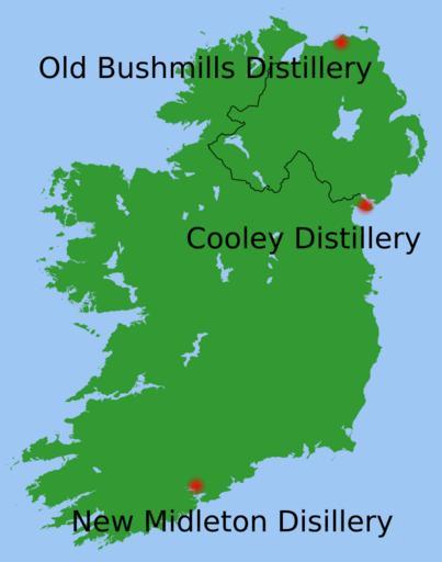 | Keywords: Irish whiskey distillery map.svg Map of locations of the three remaining whiskey distilleries in Ireland Old Midleton Distillery Old Bushmills Distillery Cooley Distillery Own 2007-12-19 Chris huh Whiskey from Ireland Midleton distillery Old Bushmills distillery Cooley Distillery |