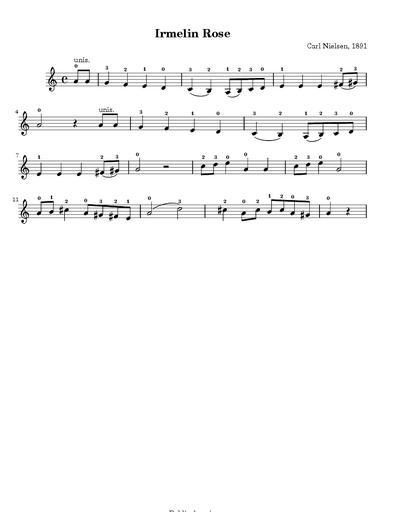 | Keywords: Irmelin Rose-violin.png Danish song composed by Carl Nielsen with text by J P Jacobson Lilypond <pre> <nowiki> include deutsch ly \version 2 6 4-5 \header title Irmelin Rose composer Carl Nielsen 1891 copyright Public domain melody \clef treble \time 4/4 \key a \minor \relative c' \partial 4 a'8-0 \markup unis a upbeat g4-3 f-2 e-1 d-0 1 c-3 h-2 a8-1 h-2 c-3 d-0 2 e4-1 e e fis8-2 gis-3 \break 3 a2-0 r4 a8 \markup unis a 4 g4-3 f-2 e-1 d-0 5 c-3 h-2 a8-1 h-2 c-3 d-0 \break 6 e4-1 e e fis8-2 gis-3 7 a2-0 r2 8 c8-2 d-3 e4-0 a -0 a 9 c8-2 d-3 e4-0 a 2-0 \break 10 a8-0 h-1 cis4-2 a8-0 gis-3 fis-2 e-1 11 a2-0 d-3 12 cis4-2 a8-0 cis-2 h-1 cis-2 a-0 gis-3 13 a4-0 r4 14 \bar \score \new Staff \melody </nowiki> </pre> Also See Irmelin_Rose mid Find midi here Sheet music thumb 250px left Music Sheet <br style clear both; > PD-old Music of Denmark Compositions by Carl Nielsen |