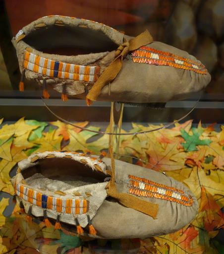 MAKE A MEME View Large Image Iroquois (probably) moccasins with quillwork, tin cones, and hair fringe, early 1700s - Bata Shoe Museum - DSC00653.JPG en Exhibit in the Bata Shoe Museum Toronto Ontario Canada This item is old enough so that its design is in the public ...