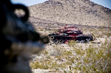 Keywords: Irving soldier rifle.jpg en A U S soldier aiming his gun at a dummy Patton tank during a training exercise at Fort Irving California Own Sfax 2009-02-22 United States Army training Tanks as firing range targets Fort Irwin Military Reservation |