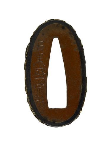 | Keywords: Ishiguro Masatsune II - Fuchi with Autumn Flowers - Walters 511064 - Mark A.jpg The fuchi is decorated with flowers emblematic of autumn pampas grass Chinese bellflower chrysanthemum and mist flower This is part of a set with Walters 51 1065 ca 1800 1850 late Edo shakudo copper silver gold cm 3 7 accession number 51 1064 16608 William T / Henry Walters Collection Baltimore date and mode of acquisition unknown Walters Art Museum Henry Walters Acquired by William T or Henry Walters Signature Ishiguro Moritsune horu; Translation Carved by Ishiguro Moritsune place of origin Edo present-day Tokyo Japan Walters Art Museum license Fuchi in the Walters Art Museum Ishiguro Masatsune II Media contributed by the Walters Art Museum needs category review |