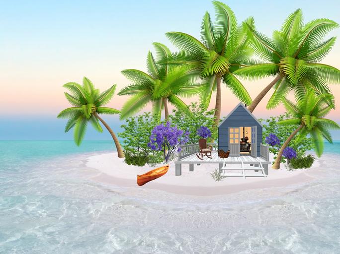 Keywords: island tropical paradise beach sea tropic sand palm trees ocean nature ile exotic shore canoe small house boat seaside cottage sandy beach cabin trees