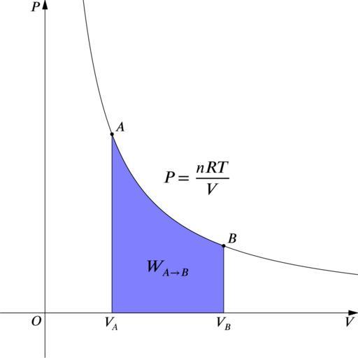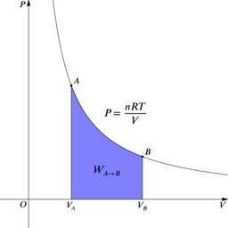 Keywords: Isothermal process.svg en Illustration of isothermal process 2011-06-20 own Netheril96 Created by Asymptote and converted by Inkscape Source file <pre> size 300 ; settings tex xelatex ; usepackage amsmath unicode-math ; texpreamble \setmathfont XITS Math ; import graph; xaxis V -50 450 Arrow ; yaxis P -50 350 Arrow ; label O 0 0 SW ; real f real x return 15000/x; ; guide g graph f f 350 350 operator ; label scale 1 2 Label P \dfrac T V g align 2 2 ; draw g ; pair A f 200 200 ;pair B 200 f 200 ; pair C 200 0 ;pair D f 200 0 ; filldraw graph f f 200 200 operator --C--D--cycle lightblue ; dot A ;dot B ; label A A NE ;label B B NE ; label V_B C S ;label V_A D S ; label scale 1 2 Label W_ A\to B 200+f 200 /2 50 ; </pre> cc-zero Uploaded with UploadWizard Isothermal process |