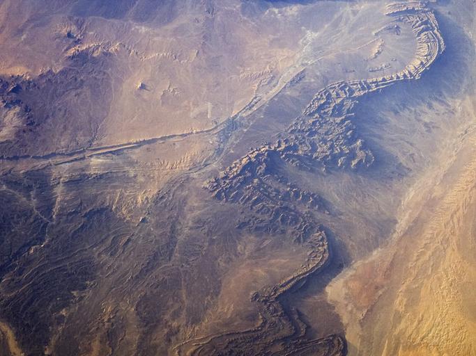 Keywords: ISS015-E-15323 lrg.jpg en The Bechar Basin of northwest Algeria formed as layers of sedimentary rocks from the Paleozoic Era 250-540 million years ago folded and cracked during collisions of Africa and Europe during the Tertiary Period 2-65 million years ago Hydrocarbon coal oil reservoirs are tucked among the fragments of sedimentary rocks and fossilized coral reefs that make up the basin's rock layers which are up to 8 000 meters thick In this photograph of part of the basin captured by astronauts on the International Space Station on June 27 2007 dark brown to tan folded ridges of these Paleozoic sedimentary layers extend across the image from top to bottom Sand dunes are visible to the north south and west of the city of Bechar gray-blue region to the left of the ridges at image center river channels are dry most of the year in the arid climate of the region Unconsolidated loose sands left in the channels by intermittent streams are transported by surface winds after the water is gone This leads to the formation of individual dunes and larger dune fields both bright tan in color along the wadi courses which also concentrate sands from other sources; dune fields are visible to the south of Bechar and at image lower right The oblique view looking at an angle not straight down from the International Space Station of this astronaut photograph accentuates cliff and dune shadows providing a sense of the topography of the region 2012-01-28 http //earthobservatory nasa gov/IOTD/view php id 7934 NASA -- Featured astronaut photograph eol jsc nasa gov/scripts/sseop/photo pl mission ISS015 roll E frame 15323 ISS015-E-15323 was acquired June 27 2007 by the www nasa gov/mission_pages/station/expeditions/expedition15/index html Expedition 15 crew with a Kodak 760C digital camera using a 70 mm lens The image is provided by the ISS Crew Earth Observations experiment and the Image Science Analysis Laboratory Johnson Space Center The image in this article has been cropped and enhanced to improve contrast The spaceflight nasa gov/home/index html International Space Station Program supports the laboratory to help astronauts take pictures of Earth that will be of the greatest value to scientists and the public and to make those images freely available on the Internet Additional images taken by astronauts and cosmonauts can be viewed at the NASA/JSC eol jsc nasa gov/ Gateway to Astronaut Photography of Earth centre of image Custom license marker 2012 01 28 Uploaded with UploadWizard Satellite pictures of Béchar Province Paleozoic geology Béchar Rivers of Béchar Province
