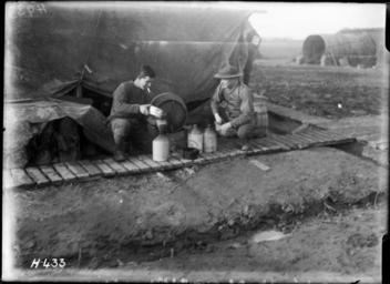 | Keywords: blackandwhite monochrome outdoor photo border black and white Soldiers pouring rum from a barrel into ceramic flagons for issue to troops in the front trenches during World War I. Photograph taken Dickebusch 2 February 1918 by Henry Armytage Sanders. Inscriptions: Inscribed - Photographer's title on negative -bottom left: H433. Quantity: 1 b&w original negative(s). Physical Description: Dry plate glass negative 4.75 x 6.5 inches Issuing the rum ration to troops in the front trenches, World War I. Royal New Zealand Returned and Services' Association :New Zealand official negatives, World War 1914-1918. Ref: 1/2-013056-G. Alexander Turnbull Library, Wellington, New Zealand. natlib.govt.nz/records/22534861 Soldiers pouring rum from a barrel into ceramic flagons for issue to troops in the front trenches during World War I. Photograph taken Dickebusch 2 February 1918 by Henry Armytage Sanders. Inscriptions: Inscribed - Photographer's title on negative -bottom left: H433. Quantity: 1 b&w original negative(s). Physical Description: Dry plate glass negative 4.75 x 6.5 inches Issuing the rum ration to troops in the front trenches, World War I. Royal New Zealand Returned and Services' Association :New Zealand official negatives, World War 1914-1918. Ref: 1/2-013056-G. Alexander Turnbull Library, Wellington, New Zealand. natlib.govt.nz/records/22534861 |