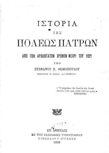 Keywords: Istoria tis Poleos Patron 1888.jpg el Εξώφυλλο του βιβλίου Ιστορία της Πόλεως Πατρών 1888 en Front page of the book Ιστορία της Πόλεως Πατρών History of the City Patras 1888 2014-01-19 12 13 24 http //anemi lib uoc gr/php/pdf_pager php rec /metadata/f/3/d/metadata-8a89e99bdd91cd019dbdee33f150c829_1273059345 tkl do 211523_w pdf lang el pageno 1 pagestart 1 width 841 height 595 maxpage 217 Stephanos Thomopoulos 1859-1939 Custom license marker 2014 01 19 PD-old Uploaded with UploadWizard History of Patras Books in Greek |