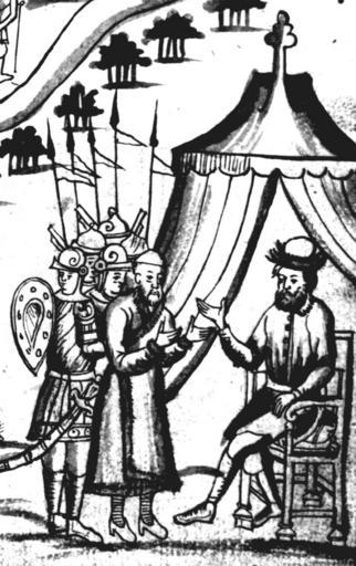 | Keywords: IstSib026 2.jpg Е мак и дво ецкий Кучума му за Кутугай Исто ия Сиби ская ультимедиа Цент ГУ http //www mmedia nsu ru/vbook/vbook/obj8/MINIATURES htm 1697 - 1703 С У Ремезов Author died more than 70 years ago - public domain PD-old Remezov Chronicle |