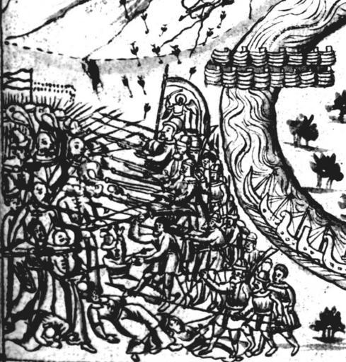 | Keywords: IstSib053 1.jpg Бой казаков с кучумлянами у засеки Исто ия Сиби ская ультимедиа Цент ГУ http //www mmedia nsu ru/vbook/vbook/obj8/MINIATURES htm 1697 - 1703 С У Ремезов Author died more than 70 years ago - public domain PD-old Remezov Chronicle |
