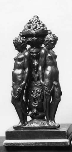 Keywords: Italian - Cover for an Incense Burner - Walters 5447.jpg This cover and its pair Walters 54 48 each with three nude young women--possibly the Three Graces--leaning against an urn were for incense burners The perfumed smoke was released through holes piercing the antique-style grotesque masks Many small bronzes had a utilitarian purpose; incense burners were a typical product of bronze casters from Padua However while the figures' proportions modeling and black patina are characteristic of Italian workmanship the elegant conception has much in common with works for the French court Perhaps the sculptor was an Italian working in France between 1570 1590 Renaissance bronze cm 36 8 accession number 54 47 20486 Henry Walters Baltimore date and mode of acquisition unknown Walters Art Museum Henry Walters Acquired by Henry Walters place of origin Paris France Walters Art Museum license Renaissance applied arts in the Walters Art Museum Italian art in the Walters Art Museum Statues of the Three Graces Media contributed by the Walters Art Museum needs category review |