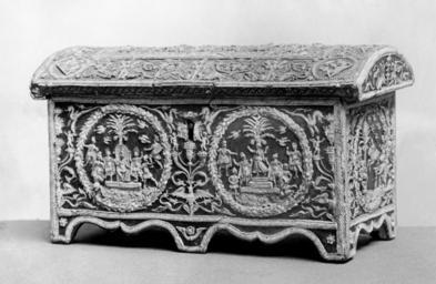 | Keywords: Italian - Jewel Box - Walters 6514 - Three Quarter.jpg This wooden casket has been finely decorated using the Italian style of carved and gilded pastigilia that was popular during the later 15th century It involves creating a paste of lead powder and egg white that could be applied to the wood and then stamped molded and either left white or gilded Such boxes were usually small and were often presented to women as gifts to be used for jewels or other small items This one is decorated with scenes meant to suggest Roman reliefs as the fantastical figures were much in vogue then due to the recent discovery of Roman wall paintings with such figures A delicate casket like this could be passed down from mother to daughter as a precious inheritance between 1475 1525 Renaissance gesso gilt wood cm 14 8 27 accession number 65 14 25770 F Ongania Venice date and mode of acquisition unknown Henry Walters Baltimore date and mode of acquisition unknown Walters Art Museum Henry Walters Acquired by Henry Walters place of origin Florence Italy Walters Art Museum license Renaissance applied arts in the Walters Art Museum Italian art in the Walters Art Museum Media contributed by the Walters Art Museum needs category review |