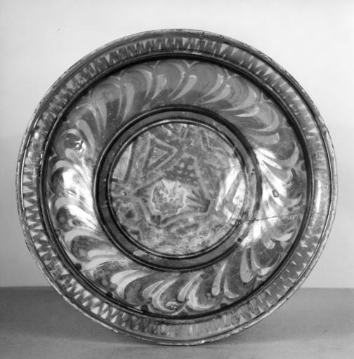 | Keywords: Italian - Small Dish with Geometric Ornament - Walters 481363.jpg This dish is painted in gold and ruby lustre and some blue It has a narrow marli with a raised edge decorated with a zigzag line In the center surrounded by painted oblique gadroons is a band of concentric circles framing a diamond set within a square With the exception of a few circles in blue the entire decoration is in lustre The back is bluish-buff with four lustre spirals between 1525 1530 Renaissance earthenware with tin glaze maiolica cm 4 6 19 7 accession number 48 1363 39722 Henry Walters Baltimore date and mode of acqusition unknown Walters Art Museum Henry Walters Acquired by Henry Walters place of origin Gubbio Italy Walters Art Museum license Italian Renaissance maiolica in the Walters Art Museum Italian art in the Walters Art Museum Media contributed by the Walters Art Museum needs category review Gubbio maiolica |