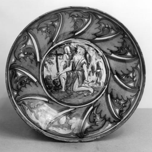 | Keywords: Italian - Small Dish with Saint Jerome - Walters 481504.jpg This small dish is painted in gold and ruby lustre and in blue and copper-green It is moulded in relief The hollow is decorated with serrated leaves set obliquely a bud surmounted by a horizontal leaf is between each In the center St Jerome kneels on one knee beside the cross with the lion lying at his right The back is bluish-buff and marked in ruby lustre with an F in the center surrounded by crooks irregularly spaced on the marli ca 1535 Renaissance earthenware with tin glaze maiolica cm 3 5 18 3 accession number 48 1504 10140 Jacques Seligmann Paris date of acqusition unknown by purchase Henry Walters city Baltimore Walters Art Museum Henry Walters Acquired by Henry Walters 1912 place of origin Gubbio Italy Walters Art Museum license Italian Renaissance maiolica in the Walters Art Museum Italian art in the Walters Art Museum Media contributed by the Walters Art Museum needs category review Gubbio maiolica |