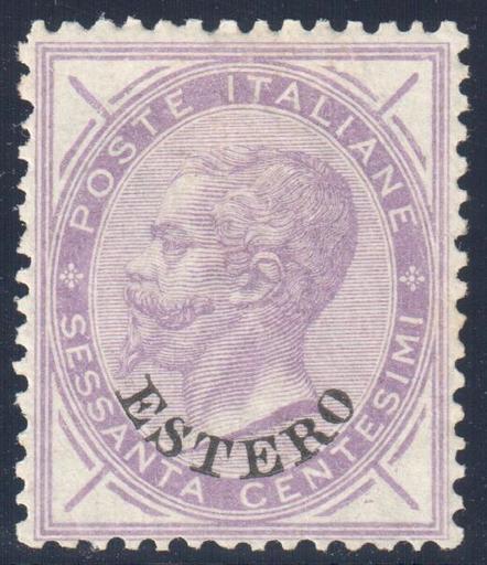 | Keywords: Italy Estero 1874 Sc10.jpg en Italy offices abroad King Victor Emmanuel II issue overprinted 'ESTERO' in black 60 centesimi lilac mint White wove paper with 'Imperial Crown' watermark Perforated 14 0 x 14 0 Typography printing by the Italian state printing offices in Turin Catalogue Sass 8 Sc 10 1874 Scan of original Government of Italy PD-old-100 PD-Italy 1874 stamps of Italy Stamps of Italian post offices abroad Overprints on stamps of Italy Purple stamps | ||||