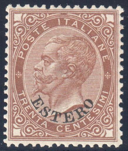 | Keywords: Italy Estero 1874 Sc8.jpg en Italy offices abroad King Victor Emmanuel II issue overprinted 'ESTERO' in black 30 centesimi brown mint White wove paper with 'Imperial Crown' watermark Perforated 14 0 x 14 0 Typography printing by the Italian state printing offices in Turin Catalogue Sass 6 Sc 8 1874 Scan of original Government of Italy PD-old-100 PD-Italy 1874 stamps of Italy Stamps of Italian post offices abroad Overprints on stamps of Italy Brown stamps | ||||