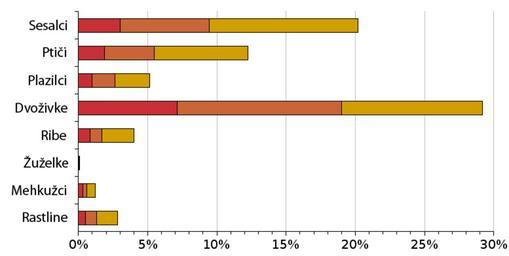Keywords: IUCN Red List 2007-sl.png Odstotek vrst iz nekaterih skupin živih bitij ki so vključene na Rdeči seznam IUCN Original narejen z Openoffice org popravljeni napisi v slovenščino Glej vire spodaj 2007-10 H2g2bob prevod Yerpo <gallery> Image IUCN_Red_List_2007 png EN version original </gallery> Legenda Barve enake kot na Image Status iucn3 1 svg <span style background CD3031 ></span> Skrajno ogrožena vrsta CR <span style background CD6531 ></span> Prizadeta vrsta EN <span style background D59D00 ></span> Ranljiva vrsta VU Vir Podatki iz http //www iucnredlist org/info/stats IUCN Red List Število vrst iz http //www iucnredlist org/info/2007RL_Stats_Table 201 pdf Tabele 1 Število vrst v kategorijah VU EN in CR iz http //www iucnredlist org/info/2007RL_Stats_Table 202 pdf Tabele 2 IUCN ne presoja statusa vseh vrst stolpec celotno število vrst tako da se odstotne vrednosti nanašajo na delež vrst ki so v seznamu Za več podatkov glej zgornje povezave wikitable Skupina Celotno število vrst Št vrst v CR EN in VU Št vrst v CR Št vrst v EN Št vrst v VU - Sesalci 5416 1094 163 349 582 - Ptiči 9956 1217 189 356 672 - Plazilci 8240 422 79 139 204 - Dvoživke 6199 1808 441 737 630 - Ribe 30000 1201 254 254 693 - Žuželke 950000 623 69 129 425 - Mehkužci 81000 978 268 224 486 - Rastline 297326 8447 1569 2278 4600 Endangered species Diagrams in Slovene |