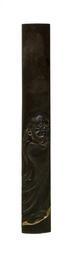Keywords: Iwamoto Konkan - Kozuka with Daruma - Walters 51739.jpg Daruma Sk Bodhidharma was an Indian Buddhist who lived in the 6th century He is recognized as the founder of Zen Buddhism Legends claim that he traveled to China and Japan Here he is shown standing on a reed which he used to cross the ocean from China to Japan The artist's signature and seal are on the reverse between 1744 1801 Edo shibuichi gold cm 9 5 l accession number 51 739 39885 Henry Walters Baltimore date and mode of acquisition unknown Walters Art Museum Henry Walters Acquired by Henry Walters signature place of origin Edo present-day Tokyo Japan Walters Art Museum license Kozuka in the Walters Art Museum Iwamoto Konkan Media contributed by the Walters Art Museum needs category review |
