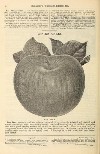 | Keywords: J.G. Harrison and Sons nurseries (16589778888).jpg 22 <br> HARRISON'S NURSBRIES BERI rN MD <br> Red Bietigneimer A rare Gerraau variety re- <br> cently introduced Fruit large to very large; skin <br> pale green mostly covered with purplish crimson; <br> flesh white firm sub-acid with a brisk pleasant <br> tlavor Tree a fine grower and abundant bearer <br> This is one of the largest and handsomest of Apples <br> and promises to be extensively cultivated September <br> and October <br> Twenty Ounce Pippin Very large nearly round; <br> yellow striped with red; quality good; vigorous and <br> good bearer; popular as a market varietj- November <br> Utter 's Red L arge round whitish and striped <br> very beautiftii and excellent sub-acid; tree vigorous <br> hardy productive requires dry soil; of great value <br> north September and October <br> Vandevere Pippin Large to very laxire rovmdish <br> flattened at both ends and very deep cavity ; greenish <br> yellow covered with stripes and blotches of dull red <br> good flavor juicy and rich Tree forms a round head; <br> \4gorous and productive October and November <br> SVagener Medium to large deep red in the sun <br> flesh firm sub-acid and excellent ven - productive <br> bears very young October to December <br> WINTER APPLE5 <br> BEX DAVIS <br> Ben Davis Fruit medium to large; roundish skin yellowish splashed and striped and <br> almost covered with red; flesh white tender juicy and sub-acid of good quality; a popular <br> kind and a good keeping variety and should be in every orchard The tree is very hardy a <br> free grower comes into bearing early and very productive It blooms late in the sprine <br> thereby often escaping the late spring frosts Very popular in the West and Southwest <br> Mid- vinter <br> Virginia December ii 1903 <br> J G Harrison Srons <br> Gentlemen The trees I ordered a short time ago arrived in <br> good condition and satisfactory beyond all expectations I vas <br> surprised to find such fine trees Thanks for your promptness <br> Yours respectliillv <br> S' E Staub <br> Louden May 1 1904 <br> Dear Sirs I was verj' -well pleased with the quality of the <br> order and for the promptness in shipping- it They are doing well <br> so far for we got them into the ground verj early and everj-thing <br> was done to make their growth a success <br> Yours respectfullv <br> C Boyh 43766109 148656 77544 Page 22 Text http //www biodiversitylibrary org/page/43766109 1904 10 5962/bhl title 77544 Harrison's Nurseries Berlin Md ; Henry G Gilbert Nursery and Seed Trade Catalog Collection NameFound Medium NameConfirmed Medium NameBankID 4904049 Biodiversity Heritage Library J G Harrison Sons nurseries Garden Stories Catalogs Harrison's Nurseries Berlin Md Nurseries Horticulture Seeds U S Department of Agriculture National Agricultural Library bhl page 43766109 dc identifier http //biodiversitylibrary org/page/43766109 bhlGardenStories Ben Davis apple BHLinbloom harrison's nurseries berlin md nurseries horticulture u s department of agriculture national agricultural library bhlgardenstories ben davis apple bhlinbloom Information field Flickr posted date ISOdate 2015-03-10 CC-BY-2 0 BioDivLibrary https //flickr com/photos/61021753 N02/16589778888 2015-08-24 01 53 01 cc-by-2 0 PD-old-70-1923 Ben Davis apple J G Harrison Sons nurseries Photos uploaded from Flickr by FĂŚ using a script |