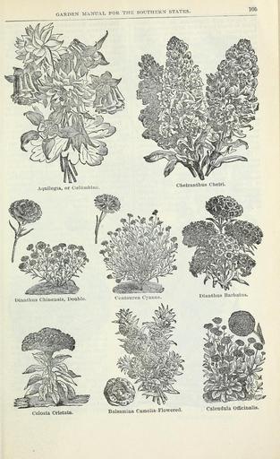 Keywords: J. Steckler Seed Co., Ltd. garden manual 1900 (16571913682).jpg ;A DEN MANUAL TOR THE SOUTHERN STATES <br> 105 <br> Celosia Cristata <br> Balsamina Camelia-Flowered <br> Calendula Officinalis 43933659 150250 78709 Page 105 Text http //www biodiversitylibrary org/page/43933659 1900 10 5962/bhl title 78709 Henry G Gilbert Nursery and Seed Trade Catalog Collection ; J Steckler Seed Co NameFound Balsamina NameConfirmed Balsamina Tourn ex Scop EOLID 5020093 NameFound Calendula NameConfirmed Calendula EOLID 59414 NameBankID 25725 NameFound Celosia NameConfirmed Celosia L EOLID 38393 NameFound Cristata NameConfirmed Cristata NameBankID 5109487 Biodiversity Heritage Library J Steckler Seed Co Ltd garden manual 1900 dealers in vegetable flower field and grass seeds Garden Stories Catalogs Flowers J Steckler Seed Co Seed industry and trade Seeds Trade catalogs Vegetables U S Department of Agriculture National Agricultural Library bhl page 43933659 dc identifier http //biodiversitylibrary org/page/43933659 bhlGardenStories BHLinbloom j steckler seed co u s department of agriculture national agricultural library bhlgardenstories bhlinbloom Information field Flickr posted date ISOdate 2015-02-18 CC-BY-2 0 BioDivLibrary https //flickr com/photos/61021753 N02/16571913682 2015-08-24 02 50 57 cc-by-2 0 PD-old-70-1923 J Steckler Seed Co Ltd garden manual 1900 Photos uploaded from Flickr by Fæ using a script |