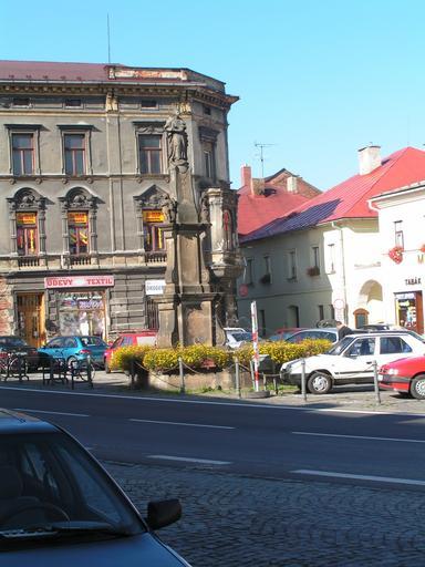 Keywords: Jablunkov-square.jpg Town square in Jablunkov Jabłonków own 2006-09-09 hugo public domain Fountain and statue of the Immaculata in Jablunkov