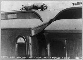 Keywords: Jack London on a train.jpg en Jack London lies on a roof of a passenger railroad car 1907 http //www loc gov/pictures/resource/cph 3a51776/ Library of Congress PD-US PD-OLD Uploaded with UploadWizard Train surfing Passenger railcar surfing Roof riding trains Train surfing in the United States History of train surfing Jack London |