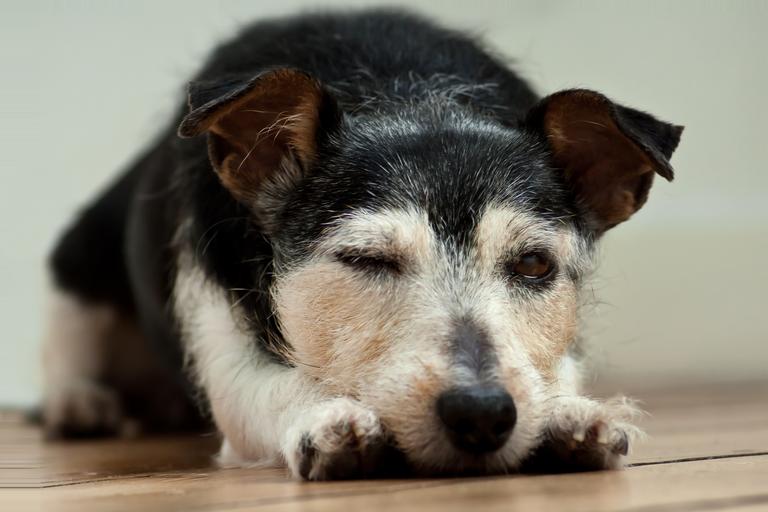 Keywords: jack russel dog half awake dog sleep animal rest doze siesta relax snout tired pet concerns ground