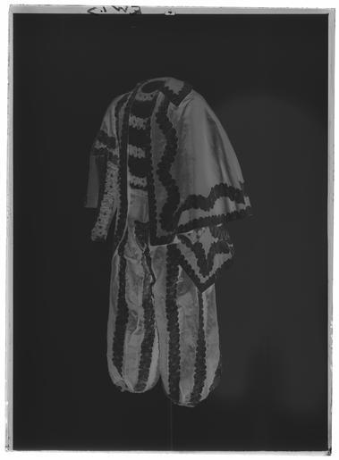 Keywords: Jacka, "Bohemiens klädning" - Livrustkammaren - 53279-negative.tif LSH artwork sv Jacka av svart atlas formsydd i fyra stycken Knäppning fram med fyra knappar klädda i rosa siden på högra stycket diameter 15 mm Två sprund nedtill i sidorna längd 195 mm och ett mitt bak längd 185 mm Dekor i form av vågklippta veckade längsgående rosa sidenband med spridda silverpaljetter <br/>Korta vida ärmar som är veckade upptill <br/>Foder i benvitt linne tuskaft Kanterna fodrade i rosa siden <br/>Gåva tillsammans med gnr 17/46-17/192 av H M Konungen Gustav V genom chefen för Kungliga Husgerådskammaren original caption end other date century 18 silk Färg svart rosa d1 - dräkt - yttermaterial material sidenatlas - silk Färg rosa d2 - dräkt - foder material siden - silk Färg rosa d5 - dräkt - knappar och spännen material siden - sequins Färg silver d1 - dräkt - yttermaterial material paljetter - linen Färg benvit d2 - dräkt - foder material linne size mm 735 bak size mm 430 size mm 300 ärm g 507 LRK place of origin original filename LN_B16286_019166 57527 inventory number LRK 21500 53279 CC0 Jacka Bohemiens klädning - Livrustkammaren - 53279 tif <gallery caption Different images of same object > File Jacka Bohemiens klädning - Livrustkammaren - 61840 tif File Jacka Bohemiens klädning - Livrustkammaren - 44718 tif File Jacka Bohemiens klädning - Livrustkammaren - 36160 tif File Jacka Bohemiens klädning - Livrustkammaren - 70373 tif </gallery> |