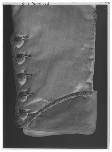 Keywords: Jacka hörande till Karl XIV Johans lilla serafimerordendräkt - Livrustkammaren - 61796-negative.tif LSH artwork sv Jacka av krabbröd sammet med långa ärmar kantad med smala guldgaloner Sömmarna täcks av ett guldsnöre Jackan är sydd med en mittsöm bak samt två snedställda sidsömmar täckta med guldsnöre Rakt skurna framstycken Knäppning mitt fram bestående av en knapprad på vänster framstycke med 14 runda höga knappar klädda med guldtråd i ett snörmakeriarbete På höger framstycke motsvarande knapphål 23 mm breda kantade med stygn av guldtråd Knäppningen är inramad med guldgalon Mitt på vardera framstycke en iskuren horisontell ficka 205 mm lång med en markerad slå 50 mm bred På vardera framstycke intill ärmen sitter en knapp Axelkarmar 70 mm breda vadderade och uppdelade i 13 tungor kantade med guldgalon Långa smala ärmar med sömmarna täckta av guldsnöre en yttersöm och en innersöm Vid ärmsluten ett 150 mm högt sprund som fortsättning på innersömmen Sprundet har en knäppning bestående av en knapprad med fem knappar samt motsvarande knapphål Ärmarna är i nederkanten uppvikta i 70 mm breda slag vilka är fodrade med gult blankt sidentyg med inslag av guldtråd och nederkanten kantad med guldgalon En 85 mm hög ståndkrage kantad med guldband upptill och i nederkanten över sömmen med guldsnöre På bakstycket under kragen sitter två knappar en knapp på vardera sida Vid dessa är fästat ett 130 mm långt axelsnöre av tvinnad guldtråd vilket löper ner mot axeln snett bak på ryggen På snöret mitt bak sitter två hyskor av två stora stygn av gul silkestråd Sömmarna bildar på baksycket från midjan fyra invikta skörtflikar På vardera sida i nedre kanten en kil Jackan är på insidan fodrad med vit sidenatlas original caption early other date century 19 velvet Färg röd material sammet - silk Färg vit material atlas - gold thread Färg guld material guldtråd size mm 600 fram size mm 650 bak size mm 1055 bröst LRK Karl XIV Johan av Sverige-Norge Jean Baptiste Bernadotte Fest och fritid vid hovet 2003 place of origin original filename LN_B15847_018727 56243 inventory number LRK 19663 61796 CC0 Jacka hörande till Karl XIV Johans lilla serafimerordendräkt - Livrustkammaren - 61796 tif <gallery caption Different images of same object > File Jacka hörande till Karl XIV Johans lilla serafimerordendräkt - Livrustkammaren - 78926 tif File Jacka hörande till Karl XIV Johans lilla serafimerordendräkt - Livrustkammaren - 53244 tif File Jacka hörande till Karl XIV Johans lilla serafimerordendräkt - Livrustkammaren - 1881 tif File Jacka hörande till Karl XIV Johans lilla serafimerordendräkt - Livrustkammaren - 70367 tif File Jacka hörande till Karl XIV Johans lilla serafimerordendräkt - Livrustkammaren - 61805 tif </gallery> |