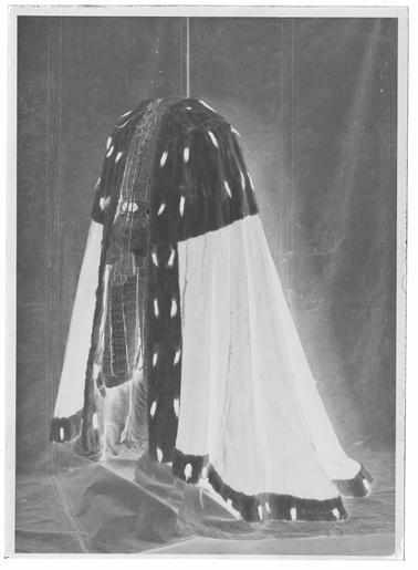 Keywords: Jacka till riksherreceremonidräkt - Livrustkammaren - 77408-negative.tif Kort jacka formsydd i fem stycken i beigefärgad sidendamast Jackan av burgundisk typ med utanpåliggande band runt om jackans övre del dekorerade med snörmakeribårder av silke så kallade breda galler Två yttre band fortsätter ner längs hela ärmen Axelklaffar i gallerform Ståndkrage 70 mm hög Jackan är kantad nedtill samt i ärmarnas nederfåll med snörmakeribårder Framkanterna avslutas nedtill med en diagonal skärning Jackan knäppes fram med 14 koniska uppåt avsmalnande snörmakeriknappar på högra framstycket höjd 15 mm diameter 10 mm Ärmarna knäppes nedtill med 7 knappar Fodrad i sidentaft Ärmarna fodrade i annat material eventuellt bomull Två skört bak Ögla i grått silkessnöre fäst på högra bakstycket 5 mm från axelsömmen 20 mm från ärmen Öglan mäter 2 x 130 mm En knapp fäst i kragsömmen på högra sidan 10 mm från axelsömmen Enligt gula liggaren är jackan av vit moiré samt hvita gallerpjen som syftar på snörmakeribården Jackan är dock dekorerad med breda galler Handskrivet med blyerts Enl E Bergman troligen förfärd till kröningen 1818 Text i gula liggaren ut nr pag 69 original caption Karl XIV Johans kröning i Stockholm 1half other date century 19 cotton Färg vit d2 - dräkt - foder material bomull - silk Färg vit d5 - dräkt - knappar och spännen material silke - silk Färg vit d4 - dräkt - passpoaler band kantning uppslag material silke size mm 475 bak size mm 490 bak size mm 440 fram size mm 700 ärm g 874 LRK place of origin original filename LN_B00759_003639 54340 inventory number LRK 19162 77408 CC0 Jacka till riksherreceremonidräkt - Livrustkammaren - 77408 tif |