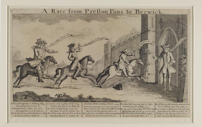 Keywords: Jacobite broadside - Race from Prestonpans to Berwick.jpg Sir John Cope Brig Gen Fawkes Colonel Lascelles and Lord Mark Kerr Shows 3 men on horse back and one man standing at the gate-- all looking worried and hurried Text beneath Sr John Suck-Lynn a Ballad About Sir John running away from battle Size cm 0 0 exhibition history Institution National Library of Scotland Prints and broadsides object history object type PD-old-70-1923 place of creation Blaikie SNPG 75241589 Jacobite broadside - Race from Prestonpans to Berwick Uploaded with GWToolset Jacobite broadside - Race from Prestonpans to Berwick http //deriv nls uk/56YK98Q/7524/75241591 2 jpg Images uploaded as part of NLS-WMUK collaboration Jacobite broadsides |
