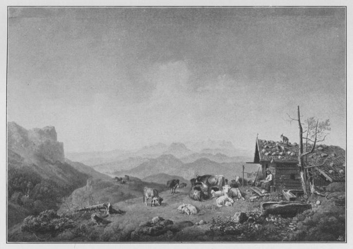 Keywords: Jahrhundertausstellung 1906 KatNr. 0232.jpg Artwork Creator Heinrich Bürkel Sonntagmorgen auf der Alp Oil Canvas cm 53 82 Kunsthalle Hamburg lt Quelle self scanned from own book Vorstand der Deutschen Jahrhundertausstellung Herausgeber žKatalog zur Ausstellung deutscher Kunst aus der Zeit von 1775 “1875 in der Königlichen Nationalgalerie Berlin Verlag F Bruckmann AG München 1906 2 Bände 1842 PD-old-70-1923 Other versions Heinrich Bürkel Jahrhundertausstellung deutscher Kunst 1906 ImageNote 1 25 18 1354 951 1401 990 2 Vordergrund gelbbraune mit Grün gemischte Wiese Das Vieh und die Hütte braun Graues schwach rosa belichtetes Dach In der Kleidung des Mädchens kupferrosa wie in dem Kupferkessel grau und grün Das Panorama schwach bläuliches Grau Der Himmel gelbliche Wolken auch hellblau “ Bez unten links braun H Bürkel 1842 ImageNoteEnd 1 |