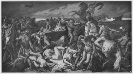 Keywords: Jahrhundertausstellung 1906 KatNr. 0483.jpg Artwork Creator Anselm Feuerbach Amazonenschlacht Oil Canvas cm 500 800 Stadt Nürnberg lt Quelle self scanned from own book Vorstand der Deutschen Jahrhundertausstellung Herausgeber žKatalog zur Ausstellung deutscher Kunst aus der Zeit von 1775 “1875 in der Königlichen Nationalgalerie Berlin Verlag F Bruckmann AG München 1906 2 Bände 1873 PD-old-70-1923 Other versions Paintings by Anselm Feuerbach in the Alte Nationalgalerie Jahrhundertausstellung deutscher Kunst 1906 Anselm Feuerbach in Jahrhundertausstellung deutscher Kunst 1906 ImageNote 1 28 24 2702 1473 2761 1539 2 Das Fleisch in einem gelblichbräunlichen Ton der in den in der Mitte liegenden Weibern am hellsten ist und nach allen Seiten namentlich nach links an Tiefe zunimmt Hier erreicht er in dem Pferd zur äußersten Linken ein tiefes Havanabraun Das korrespondierende Pferd rechts weißgrau mit Spuren von Gelb Das Grau wird am tiefsten in dem sich aufbäumenden Pferd des Hintergrundes und im Himmel zumal in der linken Hälfte und mischt sich mit dem Braun In den Stoffen herrschen weinrote Töne vor “ Bez rechts unten AFeuerbach 73 Das A und F monogrammiert “ Allgeyer-Neumann Nr 558 ImageNoteEnd 1 |