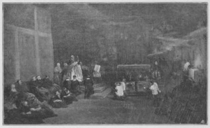Keywords: Jahrhundertausstellung 1906 KatNr. 0692b.jpg Oil Canvas cm 36 60 Ernst Hausmann Berlin lt Quelle self scanned from own book Vorstand der Deutschen Jahrhundertausstellung Herausgeber žKatalog zur Ausstellung deutscher Kunst aus der Zeit von 1775 “1875 in der Königlichen Nationalgalerie Berlin Verlag F Bruckmann AG München 1906 2 Bände 1854 PD-old-70-1923 Other versions ImageNote 1 15 18 1294 770 1324 805 2 Blattgrüner Fußboden mit dunkelgrünen Schatten Die Wand links gebräuntes Ockergelb Thronhimmel und Mittelwand dunkelbraune Töne mit Braunrot durchsetzt Auf dem kaum angedeuteten Altar der rechten Wand der gelbe Rauch brennender Kerzen Das Rot fast purpurn in den Stufen und einzelnen Gewändern wird in anderen rotbraun Die Kutten der am Boden Sitzenden meistens dunkelbraun Die drei auf den Stufen knieenden Männer schwarz “ Bez unten rechts F K Hausmann 1854 “ ImageNoteEnd 1 Friedrich Karl Hausmann Jahrhundertausstellung deutscher Kunst 1906 |