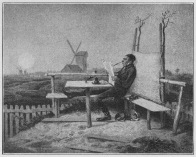 Keywords: Jahrhundertausstellung 1906 KatNr. 0750.jpg Artwork Creator Theodor Hosemann žGemeinschaftliche Laube Oil Canvas cm 29 37 Regierungsrat a D Droste Berlin lt Quelle self scanned from own book Vorstand der Deutschen Jahrhundertausstellung Herausgeber žKatalog zur Ausstellung deutscher Kunst aus der Zeit von 1775 “1875 in der Königlichen Nationalgalerie Berlin Verlag F Bruckmann AG München 1906 2 Bände 1856 PD-old-70-1923 Other versions Theodor Hosemann Jahrhundertausstellung deutscher Kunst 1906 Prints of windmills ImageNote 1 12 12 882 705 908 731 2 Fußboden Tisch und Bank aus rötlichem mit Grau durchsetztem Gelb Der Mann in dunklem Anzug mit roter Kappe und rotem Schnupftuch Auch in der Landschaft der rötliche Ton des Vordergrundes mit Grün Blauer Himmel mit rötlichgelben Wolken “ Bez unten rechts braun Monogramm F H zwischen 18 und 56 ImageNoteEnd 1 |