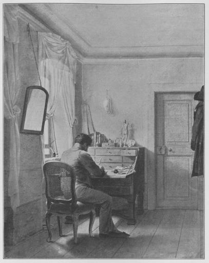 | Keywords: Jahrhundertausstellung 1906 KatNr. 0824.jpg Artwork Creator Georg Friedrich Kersting Stube mit sitzendem Mann Nach A Aubert ist der Dargestellte Gerhard von Kügelgen Oil Canvas cm 46 5 36 5 Großherzogl Schloß Weimar lt Quelle self scanned from own book Vorstand der Deutschen Jahrhundertausstellung Herausgeber žKatalog zur Ausstellung deutscher Kunst aus der Zeit von 1775 “1875 in der Königlichen Nationalgalerie Berlin Verlag F Bruckmann AG München 1906 2 Bände 1811 PD-old-100-1923 Other versions Paintings by Georg Friedrich Kersting Jahrhundertausstellung deutscher Kunst 1906 ImageNote 1 15 18 1182 1503 1226 1544 2 Kombination von Weiß Grau und Hellbraun Die Decke und Türe in einem Grau das auch im Weiß der Gardinen und Gipse mitwirkt Der graue weißbelichtete Stuhl ist mattgrün bezogen In den Wänden nimmt das Grau einen kaum wahrnehmbaren gelben und violetten Schimmer an Diese Farbe scheint nach einem violetten Grau verdichtet in dem Rock des Mannes während das Beinkleid in dem hellen Braun des Schreibtisches und noch mehr in dem Braungrau des Fußbodens gehalten ist “ Nach A Aubert ist der Dargestellte Gerhard von Kügelgen “ Bez unten links braun G Kersting 1811 ImageNoteEnd 1 |