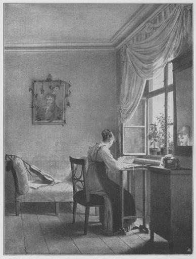 Keywords: Jahrhundertausstellung 1906 KatNr. 0825.jpg Artwork Creator Georg Friedrich Kersting Stube mit Stickerin Die Dargestellte nach A Aubert die mit Goethe befreundete Weimarer Malerin Luise Seidler die 1812 in der Wohnung G von Kügelgens wohnte Offenbar dasselbe Zimmer wie das in Nr 824 dargestellte Oil Canvas cm 46 5 36 5 Großherzogl Schloß Weimar lt Quelle self scanned from own book Vorstand der Deutschen Jahrhundertausstellung Herausgeber žKatalog zur Ausstellung deutscher Kunst aus der Zeit von 1775 “1875 in der Königlichen Nationalgalerie Berlin Verlag F Bruckmann AG München 1906 2 Bände PD-old-70-1923 Other versions Die Stickerin Jahrhundertausstellung deutscher Kunst 1906 ImageNote 1 21 18 1305 1724 1346 1774 2 Gelbbrauner mit Grau versetzter Fußboden der nach Grau erhellt im Sofa wiederkommt Stärkeres Braun in dem Holz der Möbel im Schatten rotbraun In der Wand nach Türkis zielendes Grün Gelber Rahmen mit grauem Bild Grauer Plafond mit zerstreuten schwachgelben Flecken Dasselbe Grau in den Vorhängen und im Fenster an den Lichtstellen fast weiß Das Kleid besteht aus einem bläulichgrauen Rock und grauweißer Bluse Die Schürze durchsichtiges Schwarz “ Die Dargestellte nach A Aubert die mit Goethe befreundete Weimarer Malerin Luise Seidler die 1812 in der Wohnung G von Kügelgens wohnte Offenbar dasselbe Zimmer wie das in Nr 824 dargestellte ImageNoteEnd 1 |