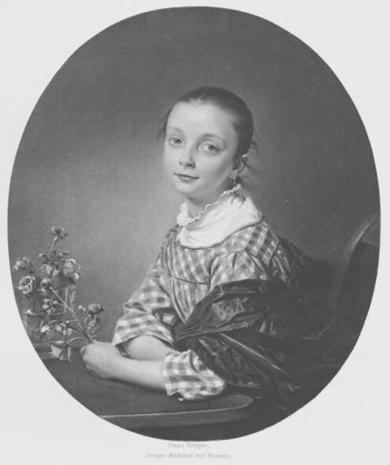 Keywords: Jahrhundertausstellung 1906 KatNr. 0929.jpg Artwork Creator Franz Krüger Junges Mädchen mit Blumen Bildnis der Christine Michaelis Nichte des Künstlers später Gattin des Anatomen Billroth Oil Canvas cm 71 61 Frau Helene Conrad geb Billroth Wien lt Quelle self scanned from own book Vorstand der Deutschen Jahrhundertausstellung Herausgeber žKatalog zur Ausstellung deutscher Kunst aus der Zeit von 1775 “1875 in der Königlichen Nationalgalerie Berlin Verlag F Bruckmann AG München 1906 2 Bände 1848 PD-old-70-1923 Other versions Portraits by Franz Krüger Jahrhundertausstellung deutscher Kunst 1906 Theodor Billroth ImageNote 1 20 16 1612 1924 1655 1973 2 Rötlichbraunes Fleisch Das Kleid gestreift aus demselben Braun Weiß und Graublau Schwarze Mantille Der Tisch dunkelmattgrün bezogen Ebenso die Blätter Die Blumen in kühlem Blau Rot und Rosa Grauer Grund “ Bez unten in der Mitte rot F Krüger px 1848 ImageNoteEnd 1 |