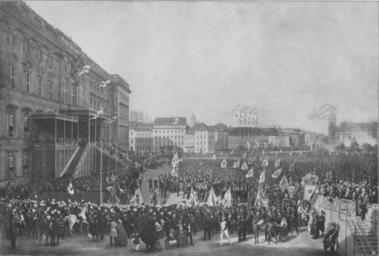 Keywords: Jahrhundertausstellung 1906 KatNr. 0945a.jpg Artwork Creator Franz Krüger Huldigung vor Friedrich Wilhelm IV am 15 Okt 1840 Oil Canvas cm 295 433 Königliches Schloß Berlin lt Quelle Beschreibung lt Quelle Auf der Tribüne rechts befinden sich von rechts nach links die Gebrüder Grimm Rauch Schelling L Tieck A v Humboldt Meyerbeer Schönlein Dieffenbach Cornelius Vorstand der Deutschen Jahrhundertausstellung Herausgeber žKatalog zur Ausstellung deutscher Kunst aus der Zeit von 1775 “1875 in der Königlichen Nationalgalerie Berlin Verlag F Bruckmann AG München 1906 2 Bände ; self scanned from own book PD-old-70-1923 Other versions Franz Krüger Jahrhundertausstellung deutscher Kunst 1906 Stadtschloss Berlin in the 19th century 1840 in Berlin Friedrich Wilhelm IV of Prussia ImageNote 1 10 3 2687 1816 2700 1823 2 Vorherrschend die verschiedenen Gelb der Häuser und das Graubraun des Schlosses Der Vorbau mattes Purpur mit goldgelben Ornamenten Die Menge mattrötliche Gesichter schwarze Kleidung Himmel blaugrau mit gelblichem Licht Auf der Tribüne rechts befinden sich von rechts nach links die Gebrüder Grimm Rauch Schelling L Tieck A v Humboldt Meyerbeer Schönlein Dieffenbach Cornelius ImageNoteEnd 1