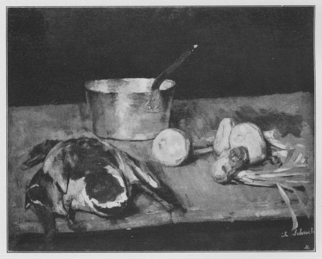 Keywords: Jahrhundertausstellung 1906 KatNr. 1596.jpg Artwork Creator Carl Schuch Kasserole und Wildente Oil Canvas cm 64 5 81 Kunsthalle Hamburg lt Quelle Vorstand der Deutschen Jahrhundertausstellung Herausgeber žKatalog zur Ausstellung deutscher Kunst aus der Zeit von 1775 “1875 in der Königlichen Nationalgalerie Berlin Verlag F Bruckmann AG München 1906 2 Bände ; self scanned from own book PD-old-70-1923 Other versions Still life paintings by Carl Schuch Jahrhundertausstellung deutscher Kunst 1906 ImageNote 1 26 34 1414 1124 1469 1183 2 er Tisch Braun auf Grau Die Ente schwarzweiß mit grauen und braungrauen à bergängen Dieselbe Kombination kehrt gemildert ohne das Schwarz in der Kasserole wieder Die Knollen des Gemüses Braungelb auf Weißgelb mit blutroten und lilaroten Stellen Die Stengel reiche Nuancen von Grün die durch gelbe Striche erhellt sind Braunschwarzer Grund “ Bez unten rechts hellgrau Ch Schuch ImageNoteEnd 1 |