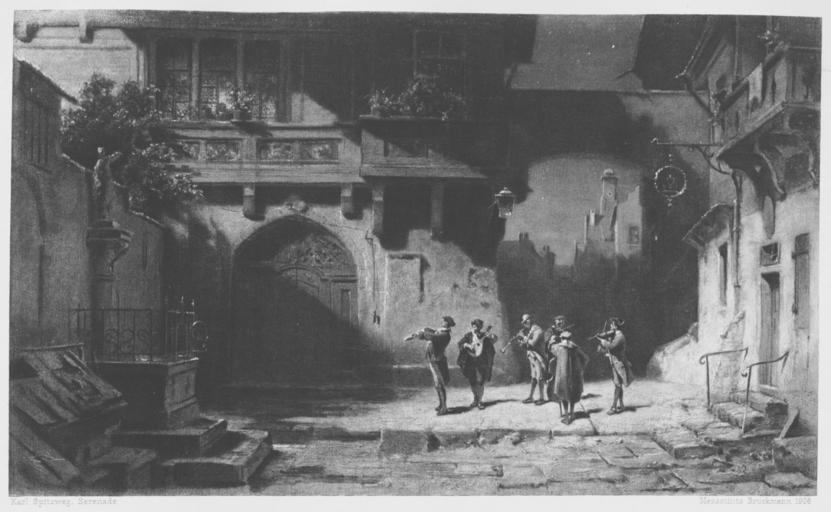 Keywords: Jahrhundertausstellung 1906 KatNr. 1681.jpg Artwork Creator Carl Spitzweg Serenade Oil Canvas cm 31 52 5 Frau Marie Barlow München lt Quelle Vorstand der Deutschen Jahrhundertausstellung Herausgeber žKatalog zur Ausstellung deutscher Kunst aus der Zeit von 1775 “1875 in der Königlichen Nationalgalerie Berlin Verlag F Bruckmann AG München 1906 2 Bände ; self scanned from own book PD-old-70-1923 Other versions Carl Spitzweg in Jahrhundertausstellung deutscher Kunst 1906 Jahrhundertausstellung deutscher Kunst 1906 ImageNote 1 32 23 2521 1535 2596 1600 2 Die Beleuchtung in einem grünlichbläulichen Ton der im grünblauen Himmel deutlich wird Dunkelbraune Schatten Einzelheiten in reinem dunklen Blau Hinter den bläulichen Butzenscheiben des Fensters orangenes Licht “ Bez unten links weiß S im Rhombus “ Ein ähnliches Bild im Rudolfinum in Prag ImageNoteEnd 1 |