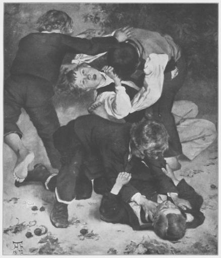 Keywords: Jahrhundertausstellung 1906 KatNr. 1756.jpg Artwork Creator Hans Thoma Raufende Buben Oil Canvas auf Holz cm 105 87 Professor Dr H Thoma Karlsruhe i B lt Quelle Vorstand der Deutschen Jahrhundertausstellung Herausgeber žKatalog zur Ausstellung deutscher Kunst aus der Zeit von 1775 “1875 in der Königlichen Nationalgalerie Berlin Verlag F Bruckmann AG München 1906 2 Bände ; self scanned from own book 1872 PD-old-70-1923 Other versions Hans Thoma in Jahrhundertausstellung deutscher Kunst 1906 Jahrhundertausstellung deutscher Kunst 1906 ImageNote 1 23 11 1908 2244 1950 2282 2 Im Boden und in dem Hintergrund soweit er nicht von dem dunkelrötlichen Blattwerk bedeckt ist Grau das auch in der Hose des mittleren Jungen und der Weste seines Angreifers wiederkehrt Sonst die Kleidung braun und namentlich schwarz Braunrötliches Fleisch “ Bez unten links schwarz Monogramm H T 1872 Bd I Thoma-Werk Bd I Nr 9 ImageNoteEnd 1 |