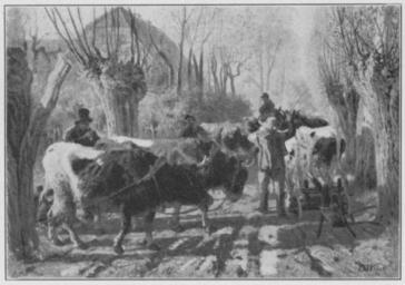 Keywords: Jahrhundertausstellung 1906 KatNr. 1979.jpg Otto Weber Ochsen mit Pflügen zur Arbeit gehend Technique Oil Canvas cm 36 50 Professor L Knaus Berlin lt Quelle Vorstand der Deutschen Jahrhundertausstellung Herausgeber žKatalog zur Ausstellung deutscher Kunst aus der Zeit von 1775 “1875 in der Königlichen Nationalgalerie Berlin Verlag F Bruckmann AG München 1906 2 Bände ; self scanned from own book 1860 PD-old-70-1923 Other versions Otto Weber Jahrhundertausstellung deutscher Kunst 1906 ImageNote 1 10 14 1102 761 1123 791 2 Helle Landschaft aus gelbbraunen rosagelblichen und grauen Tönen vor hellem graublauen Himmel Vorn auf dem Weg blauweiße Reflexe Das Vieh dunkelbraun und weiß hellbraunweiß gefleckt und dunkelgrau Die Leute in dunkelblauen und grauen Kleidern Die Gesichter in stark beschattetem Rotbraun “ Bez unten rechts schwarz O Weber “ 1860 ImageNoteEnd 1 |