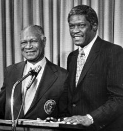 Keywords: florida state library and archives of florida statelibraryandarchivesofflorida college football collegefootball florida agricultural and mechanical university floridaagriculturalandmechanicaluniversity famu florida a&m rattlers (football team) floridaamrattlersfootballteam jake gaither jakegaither big jim williams bigjimwilliams coaches athletic directors athleticdirectors great floridians greatfloridians press conferences pressconferences african american men africanamericanmen black history month blackhistorymonth blackandwhite people monochrome black and white Local call number: PR12670 Title: Jake Gaither with "Big Jim" Williams: Tallahassee, Florida Date: February 22, 1972 General note: Athletic director Jake Gaither (left) appearing at the naming of "Big Jim" Williams as the new head football coach at Floria Agricultural and Mechanical University. Physical descrip: 1 photonegative - b&w - 3 x 5 in. Series Title: Print collections Repository: State Library and Archives of Florida, 500 S. Bronough St., Tallahassee, FL 32399-0250 USA. Contact: 850.245.6700. Archives@dos.state.fl.us Persistent URL: www.floridamemory.com/items/show/11076 Visit Florida Memory to learn more about the history of college football in Florida. Visit Florida Memory to find resources for Black History Month and to learn about the contributions of African-Americans in Florida history. Local call number: PR12670 Title: Jake Gaither with "Big Jim" Williams: Tallahassee, Florida Date: February 22, 1972 General note: Athletic director Jake Gaither (left) appearing at the naming of "Big Jim" Williams as the new head football coach at Floria Agricultural and Mechanical University. Physical descrip: 1 photonegative - b&w - 3 x 5 in. Series Title: Print collections Repository: State Library and Archives of Florida, 500 S. Bronough St., Tallahassee, FL 32399-0250 USA. Contact: 850.245.6700. Archives@dos.state.fl.us Persistent URL: www.floridamemory.com/items/show/11076 Visit Florida Memory to learn more about the history of college football in Florida. Visit Florida Memory to find resources for Black History Month and to learn about the contributions of African-Americans in Florida history. |