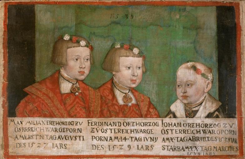 Keywords: Jakob Seisenegger 007.jpg Painting Creator Jakob Seisenegger de Kaiser Maximilian II 1527-1576 mit seinen Brüdern Ferdinand II 1529-1595 und Johann 1538-1539 de Leinwand 1539 de 40 x 60 cm Rahmenmaße 49 x 68 5 x 6 cm Institution Kunsthistorisches Museum de Beschriftung Beschriftungen auf einem Streifenam unteren Bildrand links MAXIMILIAN ERZHERÖG ZV ÖSTERREICH WAR GEPORN AM ERSTN TAG AVGVSTI DES 1527 JARS; Mitte FERDINAND ÖRZHÖRZOG ZV ÖSTERREICH WAR GEPORN AM 14 TAG IVNY DES 1529 IARS; rechts IOHAN ÖRZHÖRZOG ZV ÖSTERREICH WAR GPORN AM X TAG ABRILL DES 1538 IAR STARB AM XX TAG MARCI DES 1539 IARS<br/> Inv -Nr GG_8191<br/> Provenienz Ambraser Slg <br/> Abgebildete Personen Erzherzog Ferdinand II Sohn des Ferdinand I von Habsburg Österreich Landesherr von Tirol Erzherzog Johann Sohn des Ferdinand I von Habsburg Kaiser Maximilian II Sohn des Ferdinand I von Habsburg Österreich http //bilddatenbank khm at/viewArtefact id 2325 other versions PD-old-100 DEFAULTSORT 1539; Archdukes of Austria Paintings by Jakob Seisenegger in the Kunsthistorisches Museum Ferdinand II Archduke of Austria Maximilian II Holy Roman Emperor Archduke John of Austria 1539 portrait paintings Male 16th-century family portraits of royalty 16th-century portraits of children at bust length Family portraits of Holy Roman Empire rulers Group portraits with 3 persons Portrait paintings of boys Portraits of brothers Pageboy haircut |