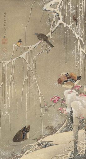 View Original:jakuchu_willow_tree_mandarin_ducks_snow.jpg (677x1250)