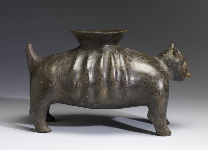 Keywords: Jalisco - Dog Effigy Vessel - Walters 20092023 - Right Side.jpg Dogs were indigenous to the ancient Americas the Mexican Hairless being the likely model for the West Mexico effigies Throughout Mesoamerica they served as companions hunting partners underworld guides and even sources of food Ceramic portrayals of dogs are particularly numerous in the shaft tombs of West Mexico placed among the burials' myriad human pottery figures and dishes of food for the journey after death Most dogs are depicted as plump and docile As tomb offerings these fattened versions may have symbolized food for the deceased's arduous underworld voyage The black-slipped canine deftly combines a jar form the most important vessel in the Mesoamerican household with an appealing rendering of a smiling dog In this example the dog's ribs recall the flutes of a gourd the ageless and most common food-service vessel throughout the ancient Americas Considered as a whole this vessel-sculpture's multiple references to food suggest that it too alludes to dogs as sustenance 300 BC-AD 200 Archaic burnished earthenware H 8 3/16 x L 13 15/16 x W 7 1/2 in 20 8 x 35 4 x 19 cm accession number 2009 20 23 80178 Ron Messick Fine Arts Santa Fe New Mexico date and mode of acquisition unknown John G Bourne 1990s by purchase Walters Art Museum Gift of John Bourne 2009 place of origin Jalisco Mexico Walters Art Museum license Pottery from ancient Jalisco in the Walters Art Museum Dogs in Pre-Columbian art |