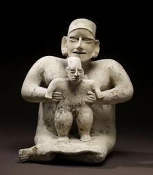 Keywords: Jalisco - Mother and Child - Walters 20092015.jpg A mother proudly supports her male child who with her help stands securely on her lap She sits in the proper position for women legs folded to the side and concealed below her wrap skirt This cream-slipped sculpture was made during the culmination of the shaft tomb tradition in West Mexico when tombs were filled with spirited figural sculptures and decorated pottery vessels and the bodies of the deceased were dressed in fine clothing and jewelry of shell and stone The figures' cream-slipped surface and the restrained painting with which her dress is depicted are characteristic of an artistic substyle of the famous El Arenal Brown sculptural tradition of northern Jalisco Jalisco's pottery sculptors created a vast array of figures portraying all manner of social and political personages The figures are famous for the renderings of warriors brandishing shields and club-weapons and wearing helmets and armor of cotton batting Others portray members of the ruling elite majestically standing with staff of office in hand Shamans and healing rites were frequently depicted as were individuals afflicted with diseases or congenital deformities Portrayals of women were equally prominent the majority featuring either their political or spiritual shamanic powers or their magical ability to create life in the form of children This sculpture is a particularly informal yet stately expression of the procreative power of women and their lifelong calling as nurturers 100 BC-AD 200 earthenware white slip with black and red paint cm 37 2 30 9 23 2 accession number 2009 20 15 80170 Michael Robins date and mode of acquisition unknown John G Bourne 1990s mode of acquisition unknown Walters Art Museum Gift of John Bourne 2009 place of origin Jalisco Mexico Walters Art Museum license Pottery from ancient Jalisco in the Walters Art Museum Art of Mexico Media contributed by the Walters Art Museum needs category review Statues of mothers with one child |